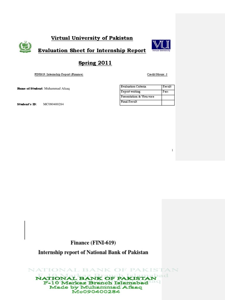 Name of the organization: National Bank of Pakistan Name of the Internee: Muhammad Afaaq Student ID: MC090400284 Session: 2009 - 2011 Submission date of the internship report: 07-07-2011 Name of the University: Virtual University of Pakistan