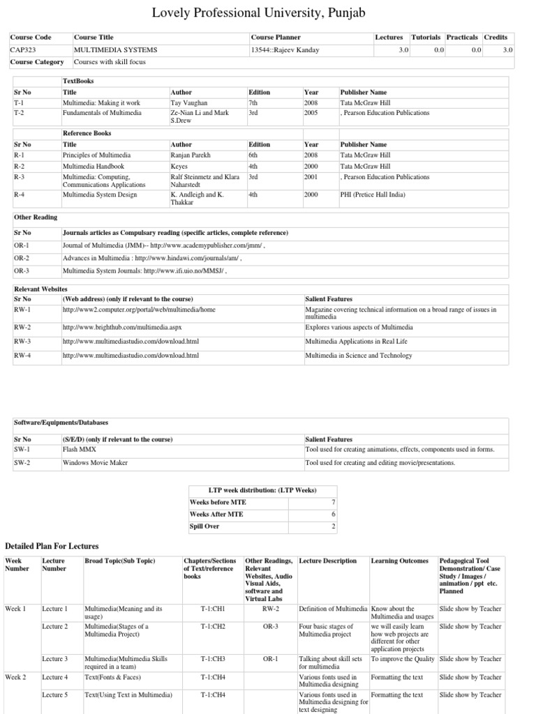 Course Code CAP323 Course Category Course Title MULTIMEDIA SYSTEMS Courses with skill focus Course Planner 13544::Rajeev Kanday Lectures 3.0 Tutorials Practicals Credits 0.0 0.0 3.0