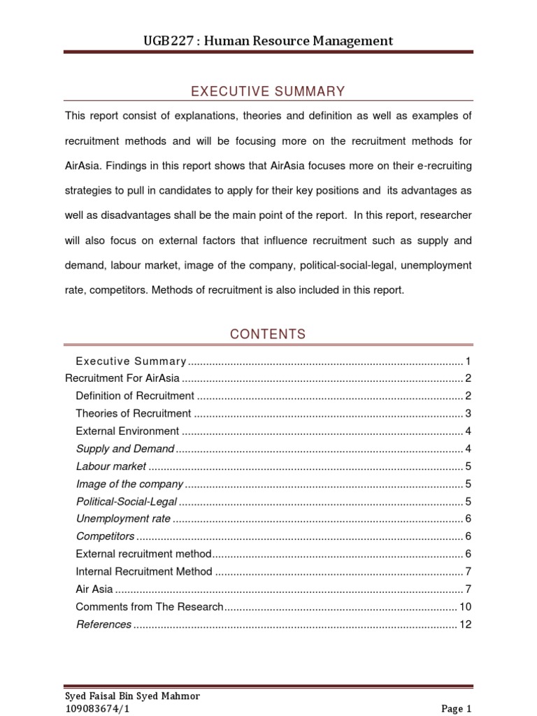 This report consist of explanations, theories and definition as well as examples of recruitment methods and will be focusing more on the recruitment methods for AirAsia. Findings in this report shows that AirAsia focuses more on their e-recruiting strategies to pull in candidates to apply for their key positions and its advantages as well as disadvantages shall be the main point of the report. In this report, researcher will also focus on external factors that influence recruitment such as supply and demand, labour market, image of the company, political-social-legal, unemployment rate, competitors. Methods of recruitment is also included in this report.