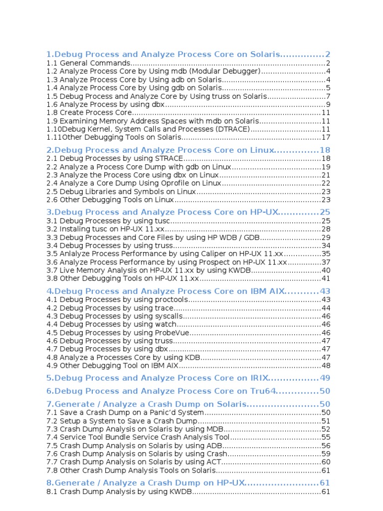 5.Debug Process and Analyze Process Core on IRIX.................49 6.Debug Process and Analyze Process Core on Tru64..............50 7.Generate / Analyze a Crash Dump on Solaris........................50