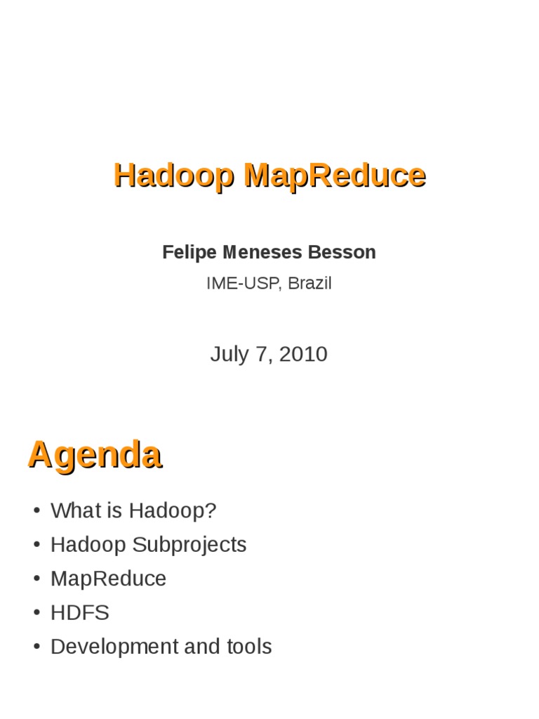 Project of Apache Software Foundation Most written in Java Inspired in Google MapReduce and GFS (Google File System)