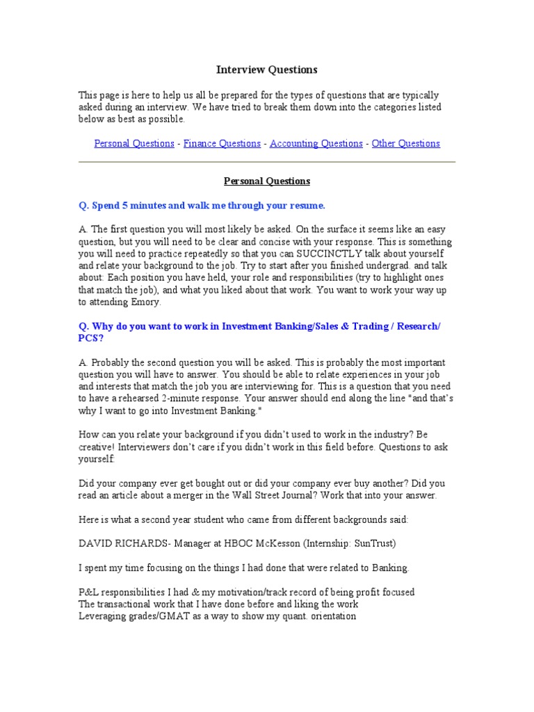 This page is here to help us all be prepared for the types of questions that are typically asked during an interview. We have tried to break them down into the categories listed below as best as possible. Personal Questions - Finance Questions - Accounting Questions - Other Questions