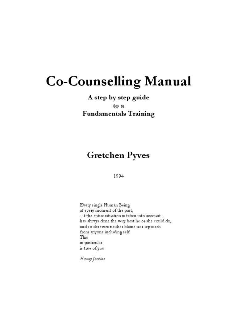 This co-counselling manual is primarily intended as an 'aide-memoire' for those who have completed a Fundamentals skills training course. It reflects the teaching concepts and philosophy presented by Gretchen Pyves and Mike Bray on Fundamentals courses run in the North West of England since 1983. These concepts are in line with CCI (Co-Counselling International) principles as formulated and advocated by John Heron, but they also reflect the particular style developed by these two Cofacilitators. This manual is also intended for those who are interested in learning about co-counselling. Please note that it is not intended as an alternative to attending a Fundamentals course. The skills of cocounselling are learnt by attending a course run by an accredited Teacher of Co-Counselling. A reference section is presented at the back of this manual as a help during co-counselling sessions.