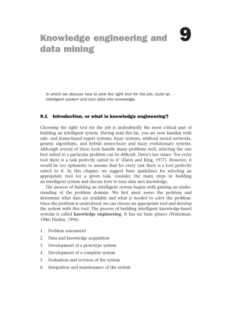 Choosing the right tool for the job is undoubtedly the most critical part of building an intelligent system. Having read this far, you are now familiar with rule- and frame-based expert systems, fuzzy systems, articial neural networks, genetic algorithms, and hybrid neuro-fuzzy and fuzzy evolutionary systems. Although several of these tools handle many problems well, selecting the one best suited to a particular problem can be difcult. Daviss law states: For every tool there is a task perfectly suited to it (Davis and King, 1977). However, it would be too optimistic to assume that for every task there is a tool perfectly suited to it. In this chapter, we suggest basic guidelines for selecting an appropriate tool for a given task, consider the main steps in building an intelligent system and discuss how to turn data into knowledge. The process of building an intelligent system begins with gaining an understanding of the problem domain. We rst must assess the problem and determine what data are available and what is needed to solve the problem. Once the problem is understood, we can choose an appropriate tool and develop the system with this tool. The process of building intelligent knowledge-based systems is called knowledge engineering. It has six basic phases (Waterman, 1986; Durkin, 1994): 1 2 3 4 5 6 Problem assessment Data and knowledge acquisition Development of a prototype system Development of a complete system Evaluation and revision of the system Integration and maintenance of the system