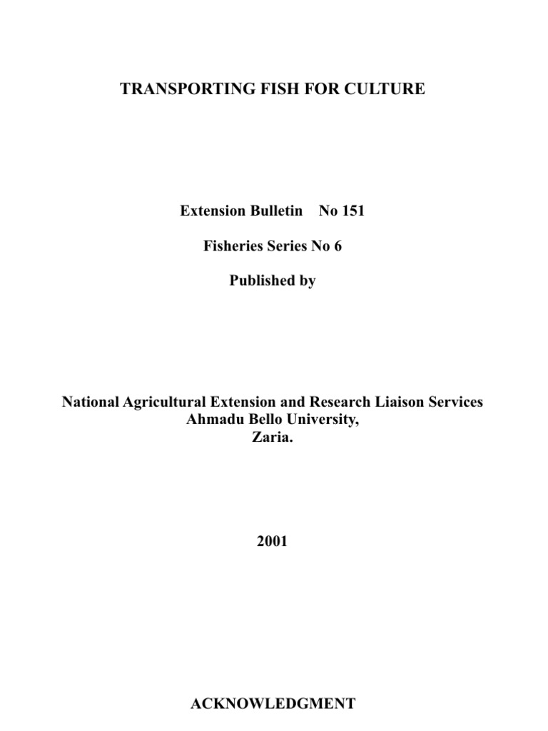 BIBLIOGRAPHY 1. Bolorunduro P. I. 1995. Fish Seed Selection, Transportation and Stocking. Technical Paper for training of Fisheries Subject Matter Specialists of Agricultural Development Projects at Monthly Technology Review Meetings.5p Bolorunduro P. I. and A. Y. Abdullah 1996. Water Quality Management in Fish Culture NAERLS Extension Bulletin No.98. Fisheries Series No.3, 52p I C A .1990. International Center For Aquaculture. Auburn University. Transporting Fish Water Harvesting and Aquaculture For Rural Development G T 1 19P Madu, C. T. 1999. Transportation of live fish. NIFFR Guide Series. No. 12. Viveen W. J. A. et al .1986. Practical Manual for the Culture of African Catfish (Clarias garienpinus) 93 P.