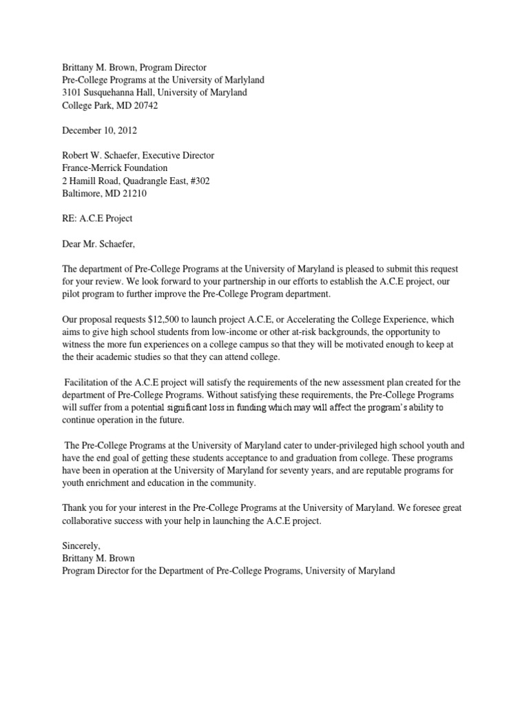 Brown, Program Director Pre-College Programs at the University of Marlyland 3101 Susquehanna Hall, University of Maryland College Park, MD 20742 December 10, 2012 Robert W. Schaefer, Executive Director France-Merrick Foundation 2 Hamill Road, Quadrangle East, #302 Baltimore, MD 21210 RE: A.C.E Project Dear Mr. Schaefer, The department of Pre-College Programs at the University of Maryland is pleased to submit this request for your review. We look forward to your partnership in our efforts to establish the A.C.E project, our pilot program to further improve the Pre-College Program department. Our proposal requests $12,500 to launch project A.C.E, or Accelerating the College Experience, which aims to give high school students from low-income or other at-risk backgrounds, the opportunity to witness the more fun experiences on a college campus so that they will be motivated enough to keep at the their academic studies so that they can attend college. Facilitation of the A.C.E project will satisfy the requirements of the new assessment plan created for the department of Pre-College Programs. Without satisfying these requirements, the Pre-College Programs will suffer from a potential significant loss in funding which may will affect the programs ability to continue operation in the future. The Pre-College Programs at the University of Maryland cater to under-privileged high school youth and have the end goal of getting these students acceptance to and graduation from college. These programs have been in operation at the University of Maryland for seventy years, and are reputable programs for youth enrichment and education in the community. Thank you for your interest in the Pre-College Programs at the University of Maryland. We foresee great collaborative success with your help in launching the A.C.E project. Sincerely, Brittany M. Brown Program Director for the Department of Pre-College Programs, University of Maryland