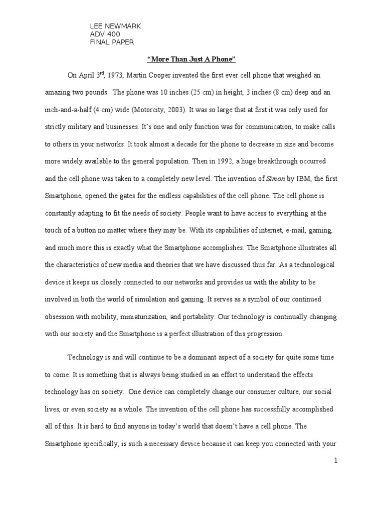 More Than Just A Phone On April 3rd, 1973, Martin Cooper invented the first ever cell phone that weighed an amazing two pounds. The phone was 10 inches (25 cm) in height, 3 inches (8 cm) deep and an inch-and-a-half (4 cm) wide (Motorcity, 2003). It was so large that at first it was only used for strictly military and businesses. Its one and only function was for communication, to make calls to others in your networks. It took almost a decade for the phone to decrease in size and become more widely available to the general population. Then in 1992, a huge breakthrough occurred and the cell phone was taken to a completely new level. The invention of Simon by IBM, the first Smartphone, opened the gates for the endless capabilities of the cell phone. The cell phone is constantly adapting to fit the needs of society. People want to have access to everything at the touch of a button no matter where they may be. With its capabilities of internet, e-mail, gaming, and much more this is exactly what the Smartphone accomplishes. The Smartphone illustrates all the characteristics of new media and theories that we have discussed thus far. As a technological device it keeps us closely connected to our networks and provides us with the ability to be involved in both the world of simulation and gaming. It serves as a symbol of our continued obsession with mobility, miniaturization, and portability. Our technology is continually changing with our society and the Smartphone is a perfect illustration of this progression. Technology is and will continue to be a dominant aspect of a society for quite some time to come. It is something that is always being studied in an effort to understand the effects technology has on society. One device can completely change our consumer culture, our social lives, or even society as a whole. The invention of the cell phone has successfully accomplished all of this. It is hard to find anyone in todays world that doesnt have a cell phone. The Smartphone specifically, is such a necessary device because it can keep you connected with your