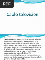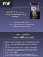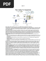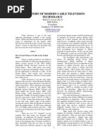 From An Overview of Cable Television in the United States: by Dr. Walter Ciciora "Prior to the 1990s, cable television systems were not intended to be general-purpose communications mechanisms. Their primary and often sole purpose was the transportation of a variety of entertainment television signals tosubscribers. Thus, they needed to be one-way transmission paths from a central location, called a headend, to each subscribers home, delivering essentially the same signals to each subscriber. The signals are intended for use with the consumer-electronics equipment that subscribers already own. This equipment is built to operate on the current U.S. television technical standard called NTSC after the organization that created it in 1941, the National Television Systems Committee. This black-and-white television standard was modified in 1953 to provide compatible color information to color television receivers, and again in 1984 to add compatible stereo sound. "The original purpose for cable television was to deliver broadcast signals in areas where they were not received in an acceptable manner with an antenna. These systems were called community antenna television, or CATV. In 1948, Ed Parson of Astoria, Oregon, built the first CATV system consisting of twin-lead transmission wire strung from housetop to housetop. In 1950, Bob Tarlton built a system in Lansford, Pennsylvania, using coaxial cable on utility poles under a franchise from the city." "In most CATV systems, off-air signals were not available or were very weak because of the terrain or the distance of the receiver from television transmitters. In some areas, such as New York City, multiple signal reflections and shadows cast by buildings made reception difficult. In both of these environments, a hard-wire method of delivery of signals to subscribers was welcomed. The first operators of these systems were retail TV receiver dealers who sought to expand the market for the sale of their products by also providing the signals that the products required. By the late 1960s, nearly all of the areas of the U.S. that could benefit from a community antenna had been served. Growth in the cable industry all but stopped. "In the mid 1970s, an embryonic technology breathed new life into cable television. This technology was satellite delivery of signals to cable systems, which added more channels than were available from terrestrial broadcasters. While satellites and earth stations were very expensive investments, these programming pioneers understood that the costs could be spread over many cable operators who, in turn, serve many subscribers."