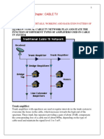 shielding in the television receiver. Low signal levels may cause poor pictures for the subscriber who insists on unauthorized splitting in the home to serve multiple receivers. Working our way back up the plant, we need a signal level of 10 to 15 dBmV at the tap to compensate for losses in the drop cable. The design objectives of the distribution part of the cable system involve an adequate level of power not only to support the attenuation characteristics of the cable, but to allow energy to be diverted to subscribers premises. Energy diverted to the subscriber is lost from the distribution cable. This loss is called flat loss because it is independent of frequency. Loss in the cable itself is a square-root function of frequency (Cable Properties) and is therefore contrasted to flat loss. Because of flat losses, relatively high power levels are required in the distribution part of the plant, typically 48 dBmV at the input to the distribution plant. These levels force the amplifiers in the distribution part of the plant to reach into regions of their transfer characteristics that are slightly non-linear. As a result, only one or two amplifiers, called line extenders, can be cascaded in the distribution part of the plant. These amplifiers are spaced 300 to 900 feet apart depending on the number of taps required by the density of homes. Because the distribution part of the plant is operated at higher power levels, non-linear effects become important. The television signal has three principal carriers, the video carrier, the audio carrier, and the color subcarrier. These concentrations of energy in the frequency domain give rise to a wide range of beats when passed through non-linearities. To minimize these effects, the audio carrier is attenuated about 15 dB below the video carrier. In the days when cable systems only carried the 12 VHF channels, second-order distortions created spectrum products that fell out of the frequency band of interest. As channels were added to fill the spectrum from 54 MHz to as much as 750 MHz (1 GHz in a couple of systems), second-order effects were minimized through the use of balanced, push-pull output circuits in amplifiers. The third-order component of the transfer characteristic dominates in many of these designs. Figure 1.8 demonstrates the triple-beat phenomena. The total effect of all thecarriers beating against each other gives rise to an interference called composite triple beat (CTB). CTB is measured with a standard procedure involving 35-channel carriers. In a 35-channel cable system, about 10,000 beat products are created. Channel 11 suffers the most with 350 of these products falling in its video passband. Third-order distortions increase nearly 6 dB for each doubling of the number of amplifiers in cascade. A 1-dB reduction in amplifier output level will generally reduce CTB by 2 dB.