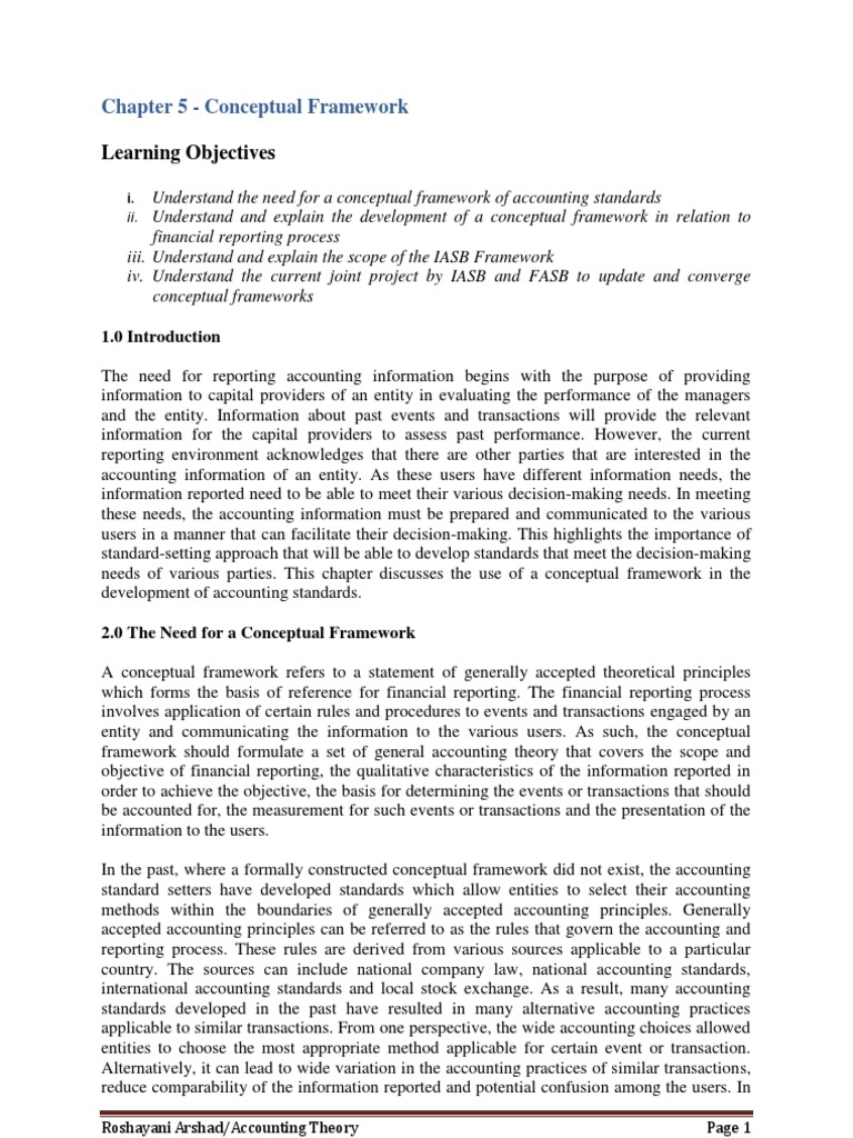 financial reporting process iii. Understand and explain the scope of the IASB Framework iv. Understand the current joint project by IASB and FASB to update and converge conceptual frameworks 1.0 Introduction The need for reporting accounting information begins with the purpose of providing information to capital providers of an entity in evaluating the performance of the managers and the entity. Information about past events and transactions will provide the relevant information for the capital providers to assess past performance. However, the current reporting environment acknowledges that there are other parties that are interested in the accounting information of an entity. As these users have different information needs, the information reported need to be able to meet their various decision-making needs. In meeting these needs, the accounting information must be prepared and communicated to the various users in a manner that can facilitate their decision-making. This highlights the importance of standard-setting approach that will be able to develop standards that meet the decision-making needs of various parties. This chapter discusses the use of a conceptual framework in the development of accounting standards. 2.0 The Need for a Conceptual Framework A conceptual framework refers to a statement of generally accepted theoretical principles which forms the basis of reference for financial reporting. The financial reporting process involves application of certain rules and procedures to events and transactions engaged by an entity and communicating the information to the various users. As such, the conceptual framework should formulate a set of general accounting theory that covers the scope and objective of financial reporting, the qualitative characteristics of the information reported in order to achieve the objective, the basis for determining the events or transactions that should be accounted for, the measurement for such events or transactions and the presentation of the information to the users. In the past, where a formally constructed conceptual framework did not exist, the accounting standard setters have developed standards which allow entities to select their accounting methods within the boundaries of generally accepted accounting principles. Generally accepted accounting principles can be referred to as the rules that govern the accounting and reporting process. These rules are derived from various sources applicable to a particular country. The sources can include national company law, national accounting standards, international accounting standards and local stock exchange. As a result, many accounting standards developed in the past have resulted in many alternative accounting practices applicable to similar transactions. From one perspective, the wide accounting choices allowed entities to choose the most appropriate method applicable for certain event or transaction. Alternatively, it can lead to wide variation in the accounting practices of similar transactions, reduce comparability of the information reported and potential confusion among the users. In