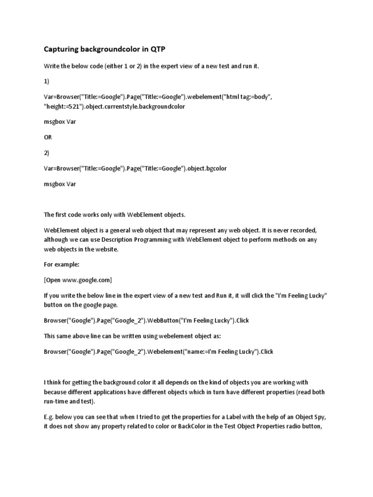 Write the below code (either 1 or 2) in the expert view of a new test and run it. 1) Var=Browser("Title:=Google").Page("Title:=Google").webelement("html tag:=body", "height:=521").object.currentstyle.backgroundcolor msgbox Var OR 2) Var=Browser("Title:=Google").Page("Title:=Google).object.bgcolor msgbox Var