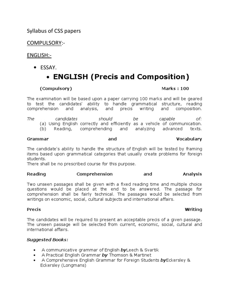 The candidates will be required to present an acceptable precis of a given passage. The unseen passage will be selected from current, economic, social, cultural and international affairs. Suggested Books: A communicative grammar of English byLeech & Svartik A Practical English Grammar by Thomson & Martinet A Comprehensive English Grammar for Foreign Students byEckersley & Eckersley (Longmans)