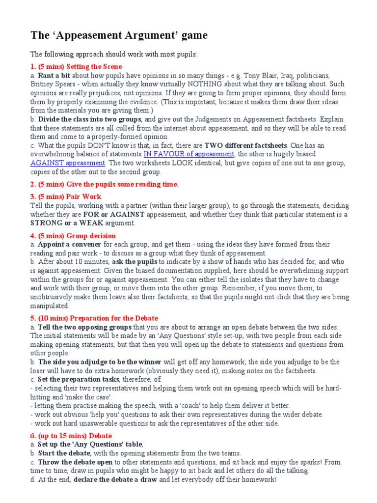 The following approach should work with most pupils: 1. (5 mins) Setting the Scene a. Rant a bit about how pupils have opinions in so many things - e.g. Tony Blair, Iraq, politicians, Britney Spears - when actually they know virtually NOTHING about what they are talking about. Such opinions are really prejudices, not opinions. If they are going to form proper opinions, they should form them by properly examining the evidence. (This is important, because it makes them draw their ideas from the materials you are giving them.) b. Divide the class into two groups, and give out the Judgements on Appeasement factsheets. Explain that these statements are all culled from the internet about appeasement, and so they will be able to read them and come to a properly-formed opinion. c. What the pupils DON'T know is that, in fact, there are TWO different factsheets. One has an overwhelming balance of statements IN FAVOUR of appeasement, the other is hugely biased AGAINST appeasement. The two worksheets LOOK identical, but give copies of one out to one group, copies of the other out to the second group. 2. (5 mins) Give the pupils some reading time. 3. (5 mins) Pair Work Tell the pupils, working with a partner (within their larger group), to go through the statements, deciding whether they are FOR or AGAINST appeasement, and whether they think that particular statement is a STRONG or a WEAK argument. 4. (5 mins) Group decision a. Appoint a convener for each group, and get them - using the ideas they have formed from their reading and pair work - to discuss as a group what they think of appeasement. b. After about 10 minutes, ask the pupils to indicate by a show of hands who has decided for, and who is against appeasement. Given the biased documentation supplied, here should be overwhelming support within the groups for or against appeasement. You can either tell the isolates that they have to change and work with their group, or move them into the other group. Remember, if you move them, to unobtrusively make them leave also their factsheets, so that the pupils might not click that they are being manipulated. 5. (10 mins) Preparation for the Debate a. Tell the two opposing groups that you are about to arrange an open debate between the two sides. The initial statements will be made by an 'Any Questions' style set-up, with two people from each side making opening statements, but that then you will open up the debate to statements and questions from other people. b. The side you adjudge to be the winner will get off any homework; the side you adjudge to be the loser will have to do extra homework (obviously they need it), making notes on the factsheets. c. Set the preparation tasks, therefore, of: - selecting their two representatives and helping them work out an opening speech which will be hardhitting and 'make the case'. - letting them practise making the speech, with a 'coach' to help them deliver it better. - work out obvious 'help you' questions to ask their own representatives during the wider debate. - work out hard unaswerable questions to ask the representatives of the other side. 6. (up to 15 mins) Debate a. Set up the 'Any Questions' table, b. Start the debate, with the opening statements from the two teams. c. Throw the debate open to other statements and questions, and sit back and enjoy the sparks! From time to time, draw in pupils who might be happy to sit back and let others do all the talking. d. At the end, declare the debate a draw and let everybody off their homework!
