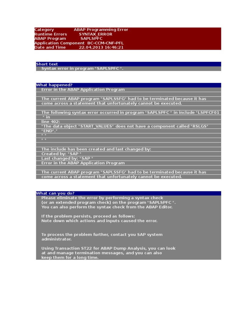 The following syntax error occurred in program "SAPLSPFC " in include "LSPFCF01