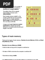 RAM is considered random access because you can access any memory cell directly if you know the row and column that intersect at that cell. RAM is made in electronic chips made of so called semiconductor material, just like processors and many other types of chips. In RAM, transistors make up the individual storage cells which can each remember an amount of data, for example, 1 or 4 bits as long as the PC is switched on. Physically, RAM consists of small electronic chips which are mounted in modules (small printed circuit boards). The modules are installed in the PCs motherboard using sockets there are typically 2, 3 or 4 of these. There are two basic types of RAM : (i) Dynamic Ram (ii) Static RAM