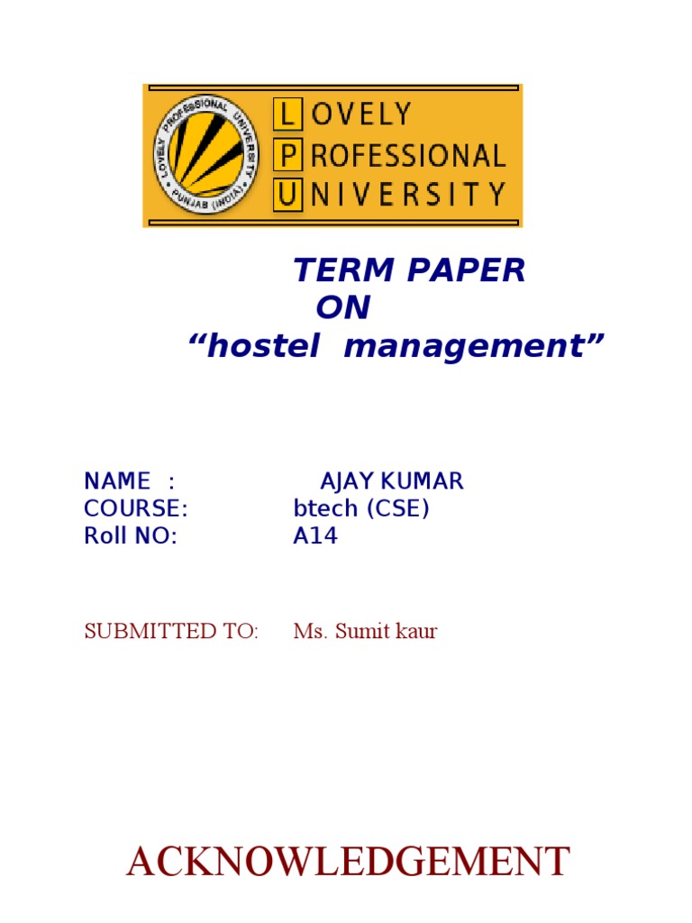 This project is a welcome and challenging experience for us as it took a great deal of hard work and dedication for its successful completion. Its our pleasure to take this opportunity to thank all those who help us directly or indirectly in preparation of this report. We would also like to very sincere thank to our project guide Lecturer Ms. Sumit kaur who supported us technically as well as morally in every stage of the project. Without their guidance and support, this project would not have seen light of the day. It gives us immense in expressing a deep sense of gratitude and sincere thanks to Lovely Professional University. There times in such project when clock beats you again and again and you run out of energy and you want to finish it once and forever. Last but not the least we thank our family for their boost and support in every sphere. Their vital push infused a sense of insurgency in us.