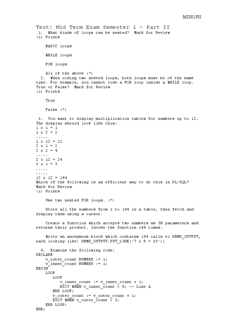 What happens at Line A when the value of V_INNER_COUNT equals 6? Mark for Review (1) Points Both loops are exited and the block's execution is terminated. The inner loop is exited but the outer loop continues execution. (*) The outer loop is exited but the inner loop continues execution. An error condition is returned. 5. What is the correct name for CASE, LOOP, WHILE, and IF-THENELSE structures ? Mark for Review (1) Points Control structures (*) Array structures Memory structures Cursor structures 6. How many ELSIF statements are you allowed to have in a compound IF statement? Mark for Review (1) Points Only one As many as you want (*) They must match the same number as the number of ELSE statements. None; the command is ELSE IF; 7. You need to execute a set of statements 10 times, increasing a counter by 1 each time. Which of the following PL/SQL constructs can do this? (Choose three) Mark for Review (1) Points (Choose all correct answers) IF ... THEN ... ELSE A WHILE loop (*) CASE ... WHEN ... THEN A FOR loop (*) A basic loop (*) 8. What is the correct form of a simple IF statement? Review (1) Points IF condition THEN statement; IF condition THEN statement; END IF; (*) Mark for