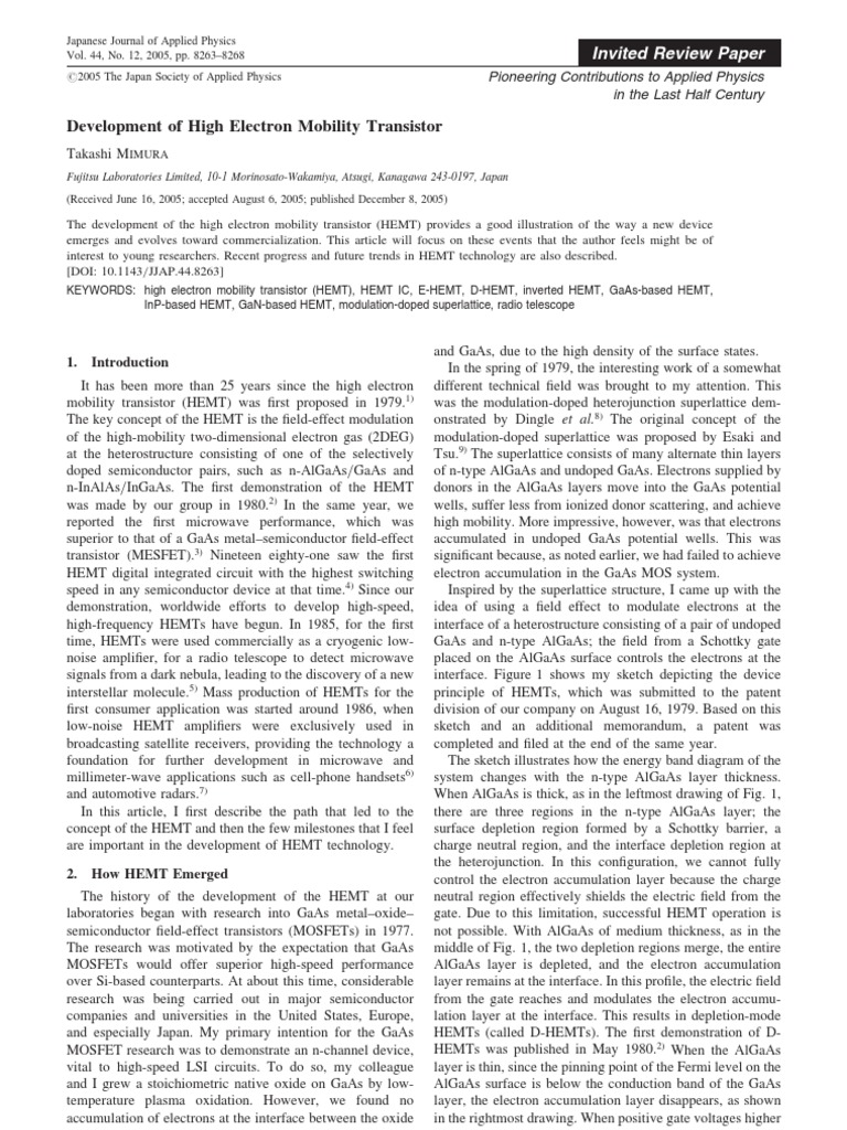It has been more than 25 years since the high electron mobility transistor (HEMT) was rst proposed in 1979.1) The key concept of the HEMT is the eld-eect modulation of the high-mobility two-dimensional electron gas (2DEG) at the heterostructure consisting of one of the selectively doped semiconductor pairs, such as n-AlGaAs/GaAs and n-InAlAs/InGaAs. The rst demonstration of the HEMT was made by our group in 1980.2) In the same year, we reported the rst microwave performance, which was superior to that of a GaAs metalsemiconductor eld-eect transistor (MESFET).3) Nineteen eighty-one saw the rst HEMT digital integrated circuit with the highest switching speed in any semiconductor device at that time.4) Since our demonstration, worldwide eorts to develop high-speed, high-frequency HEMTs have begun. In 1985, for the rst time, HEMTs were used commercially as a cryogenic lownoise amplier, for a radio telescope to detect microwave signals from a dark nebula, leading to the discovery of a new interstellar molecule.5) Mass production of HEMTs for the rst consumer application was started around 1986, when low-noise HEMT ampliers were exclusively used in broadcasting satellite receivers, providing the technology a foundation for further development in microwave and millimeter-wave applications such as cell-phone handsets6) and automotive radars.7) In this article, I rst describe the path that led to the concept of the HEMT and then the few milestones that I feel are important in the development of HEMT technology. 2. How HEMT Emerged