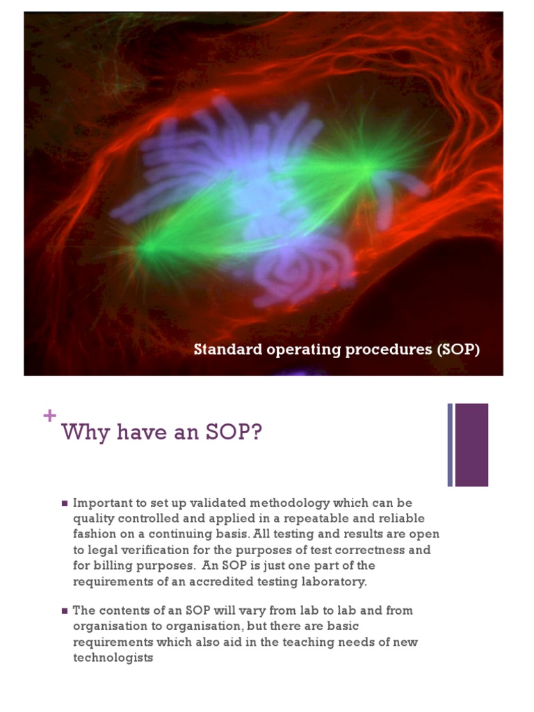 Important to set up validated methodology which can be quality controlled and applied in a repeatable and reliable fashion on a continuing basis. All testing and results are open to legal verification for the purposes of test correctness and for billing purposes. An SOP is just one part of the requirements of an accredited testing laboratory. The contents of an SOP will vary from lab to lab and from organisation to organisation, but there are basic requirements which also aid in the teaching needs of new technologists