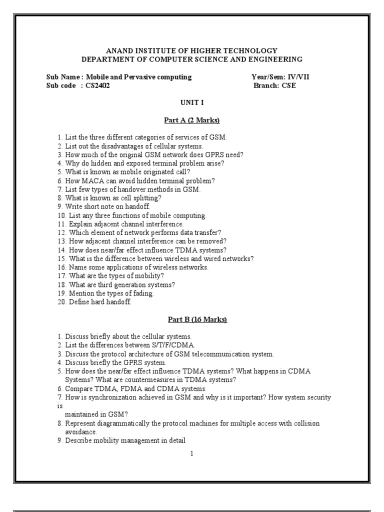 Sub code : CS2402 UNIT I Part A (2 Marks) 1. List the three different categories of services of GSM. 2. List out the disadvantages of cellular systems. 3. How much of the original GSM network does GPRS need? 4. Why do hidden and exposed terminal problem arise? 5. What is known as mobile originated call? 6. How MACA can avoid hidden terminal problem? 7. List few types of handover methods in GSM. 8. What is known as cell splitting? 9. Write short note on handoff. 10. List any three functions of mobile computing. 11. Explain adjacent channel interference. 12. Which element of network performs data transfer? 13. How adjacent channel interference can be removed? 14. How does near/far effect influence TDMA systems? 15. What is the difference between wireless and wired networks? 16. Name some applications of wireless networks. 17. What are the types of mobility? 18. What are third generation systems? 19. Mention the types of fading. 20. Define hard handoff. Part B (16 Marks) 1. Discuss briefly about the cellular systems. 2. List the differences between S/T/F/CDMA. 3. Discuss the protocol architecture of GSM telecommunication system. 4. Discuss briefly the GPRS system. 5. How does the near/far effect influence TDMA systems? What happens in CDMA Systems? What are countermeasures in TDMA systems? 6. Compare TDMA, FDMA and CDMA systems. 7. How is synchronization achieved in GSM and why is it important? How system security is maintained in GSM? 8. Represent diagrammatically the protocol machines for multiple access with collision avoidance. 9. Describe mobility management in detail 1 Year/Sem: IV/VII Branch: CSE