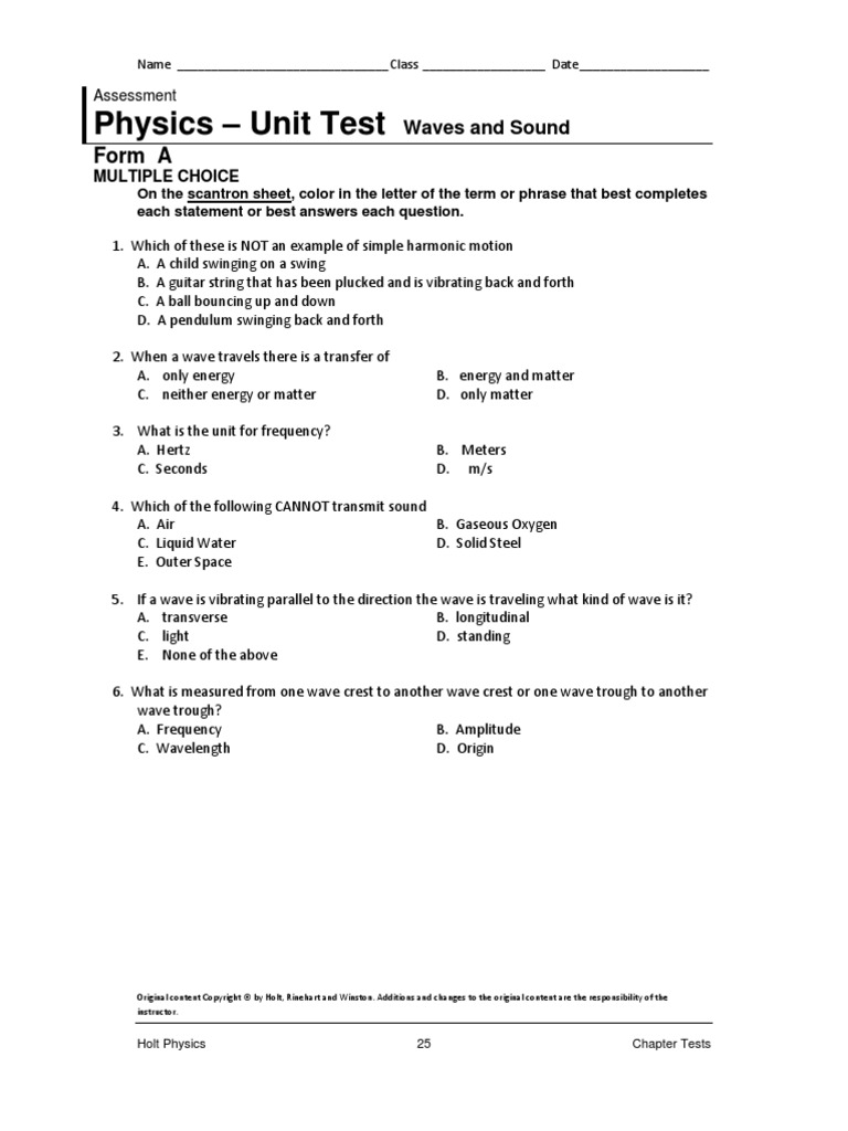 1. Which of these is NOT an example of simple harmonic motion A. A child swinging on a swing B. A guitar string that has been plucked and is vibrating back and forth C. A ball bouncing up and down D. A pendulum swinging back and forth 2. When a wave travels there is a transfer of A. only energy C. neither energy or matter 3. What is the unit for frequency? A. Hertz C. Seconds