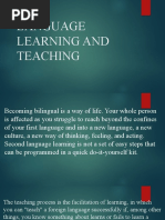 rules deductively for themselves. It focuses on building a learners experiences and providing learning tasks that can challenge, but also function as intellectual scaffolding to help pupils learn and progress through the curriculum. Broadly speaking, cognitive theory is interested in how people understand material, and thus in aptitude and capacity to learn and learning styles (see Atherton). As such it is the basis of constructivism and can be placed somewhere in the middle of the scale between behavioural and constructivist learning. Chomsky Noam Chomsky is identified with the Innatist or Nativist theory. As seen in the discussion under the age factor, Chomsky claims that children are biologically programmed to acquire language, as they are for other biological functions such as walking, which a child normally learns without being taught. While the environment supplies people who talk to the child, language acquisition is an unconscious process. The child activates the Language Acquisition Device (LAD), an innate capability or blueprint that endows the child with the capability to develop speech from a universal grammar.