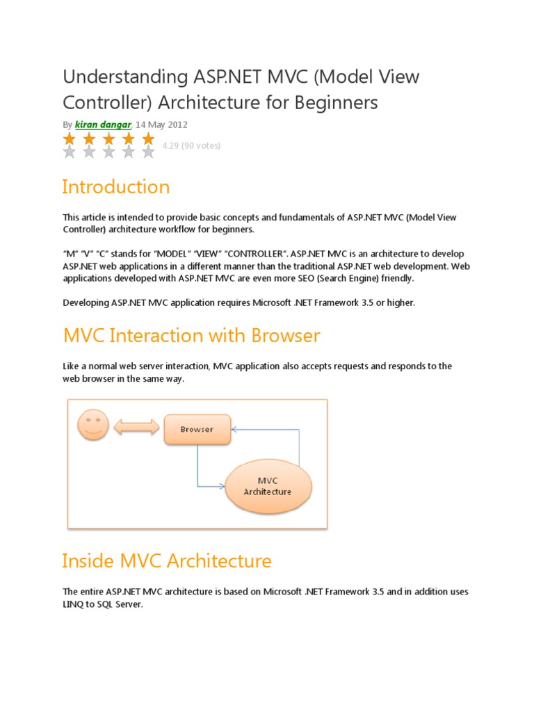 This article is intended to provide basic concepts and fundamentals of ASP.NET MVC (Model View Controller) architecture workflow for beginners. M V C stands for MODEL VIEW CONTROLLER. ASP.NET MVC is an architecture to develop ASP.NET web applications in a different manner than the traditional ASP.NET web development. Web applications developed with ASP.NET MVC are even more SEO (Search Engine) friendly. Developing ASP.NET MVC application requires Microsoft .NET Framework 3.5 or higher.