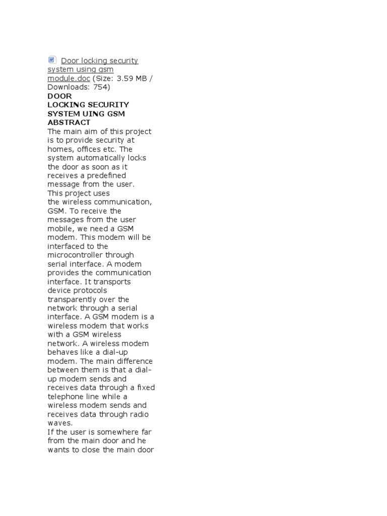 59 MB / Downloads: 754) DOOR LOCKING SECURITY SYSTEM UING GSM ABSTRACT The main aim of this project is to provide security at homes, offices etc. The system automatically locks the door as soon as it receives a predefined message from the user. This project uses the wireless communication, GSM. To receive the messages from the user mobile, we need a GSM modem. This modem will be interfaced to the microcontroller through serial interface. A modem provides the communication interface. It transports device protocols transparently over the network through a serial interface. A GSM modem is a wireless modem that works with a GSM wireless network. A wireless modem behaves like a dial-up modem. The main difference between them is that a dialup modem sends and receives data through a fixed telephone line while a wireless modem sends and receives data through radio waves. If the user is somewhere far from the main door and he wants to close the main door