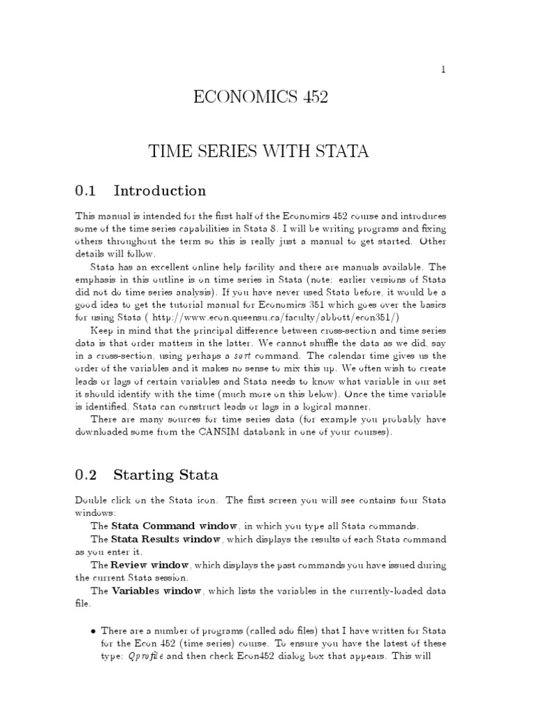 This manual is intended for the rst half of the Economics 452 course and introduces some of the time series capabilities in Stata 8. I will be writing programs and xing others throughout the term so this is really just a manual to get started. Other details will follow. Stata has an excellent online help facility and there are manuals available. The emphasis in this outline is on time series in Stata (note: earlier versions of Stata did not do time series analysis). If you have never used Stata before, it would be a good idea to get the tutorial manual for Economics 351 which goes over the basics for using Stata ( http://www.econ.queensu.ca/faculty/abbott/econ351/) Keep in mind that the principal dierence between cross-section and time series data is that order matters in the latter. We cannot shue the data as we did, say in a cross-section, using perhaps a sort command. The calendar time gives us the order of the variables and it makes no sense to mix this up. We often wish to create leads or lags of certain variables and Stata needs to know what variable in our set it should identify with the time (much more on this below). Once the time variable is identied, Stata can construct leads or lags in a logical manner. There are many sources for time series data (for example you probably have downloaded some from the CANSIM databank in one of your courses).