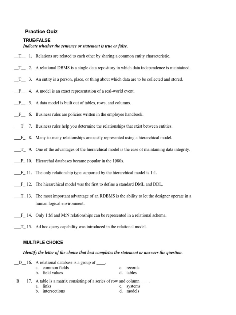 TRUE/FALSE Indicate whether the sentence or statement is true or false. __T__ 1. Relations are related to each other by sharing a common entity characteristic. __T__ 2. A relational DBMS is a single data repository in which data independence is maintained. __T__ 3. An entity is a person, place, or thing about which data are to be collected and stored. __F__ 4. A model is an exact representation of a real-world event. __F__ 5. A data model is built out of tables, rows, and columns. __F__ 6. Business rules are policies written in the employee handbook. ___T_ 7. Business rules help you determine the relationships that exist between entities. ___F_ 8. Many-to-many relationships are easily represented using a hierarchical model. ___T_ 9. One of the advantages of the hierarchical model is the ease of maintaining data integrity. ___F_ 10. Hierarchal databases became popular in the 1980s. ___F_ 11. The only relationship type supported by the hierarchical model is 1:1. ___F_ 12. The hierarchical model was the first to define a standard DML and DDL. ___T_ 13. The most important advantage of an RDBMS is the ability to let the designer operate in a human logical environment. ___F_ 14. Only 1:M and M:N relationships can be represented in a relational schema. ___T_ 15. Ad hoc query capability was introduced in the relational model.