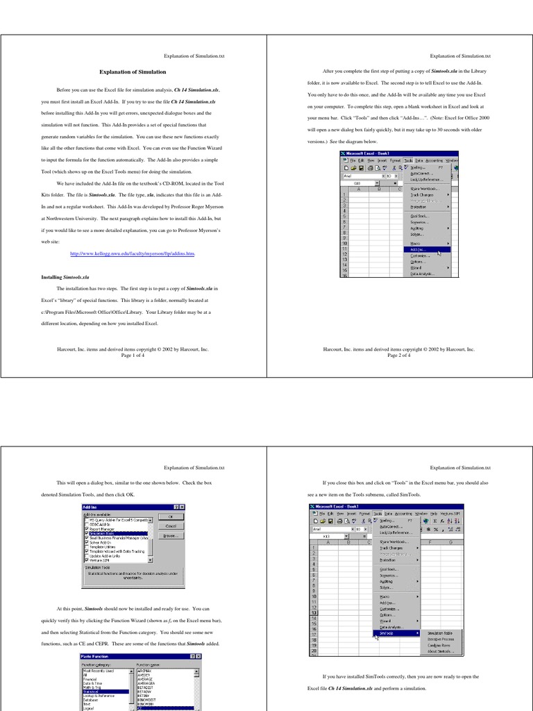 You only have to do this once, and the Add-In will be available any time you use Excel you must first install an Excel Add-In. If you try to use the file Ch 14 Simulation.xls on your computer. To complete this step, open a blank worksheet in Excel and look at before installing this Add-In you will get errors, unexpected dialogue boxes and the your menu bar. Click Tools and then click Add-Ins. (Note: Excel for Office 2000 simulation will not function. This Add-In provides a set of special functions that will open a new dialog box fairly quickly, but it may take up to 30 seconds with older generate random variables for the simulation. You can use these new functions exactly versions.) See the diagram below. like all the other functions that come with Excel. You can even use the Function Wizard to input the formula for the function automatically. The Add-In also provides a simple Tool (which shows up on the Excel Tools menu) for doing the simulation. We have included the Add-In file on the textbooks CD-ROM, located in the Tool Kits folder. The file is Simtools.xla. The file type, xla, indicates that this file is an AddIn and not a regular worksheet. This Add-In was developed by Professor Roger Myerson at Northwestern University. The next paragraph explains how to install this Add-In, but if you would like to see a more detailed explanation, you can go to Professor Myersons web site: http://www.kellogg.nwu.edu/faculty/myerson/ftp/addins.htm.