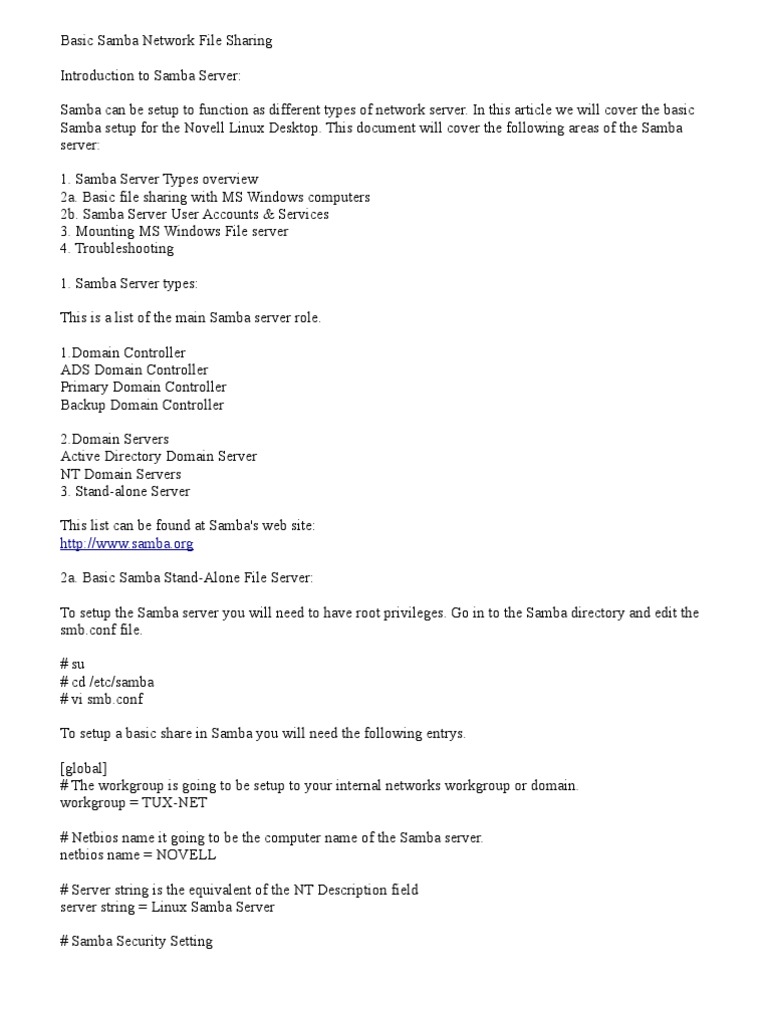 server. In this article we will cover the basic Samba setup for the Novell Linux Desktop. This document will cover the following areas of the Samba server: 1. Samba Server Types overview 2a. Basic file sharing with MS Windows computers 2b. Samba Server User Accounts & Services 3. Mounting MS Windows File server 4. Troubleshooting 1. Samba Server types: This is a list of the main Samba server role. 1.Domain Controller ADS Domain Controller Primary Domain Controller Backup Domain Controller 2.Domain Servers Active Directory Domain Server NT Domain Servers 3. Stand-alone Server This list can be found at Samba's web site: http://www.samba.org 2a. Basic Samba Stand-Alone File Server: To setup the Samba server you will need to have root privileges. Go in to the Samba directory and edit the smb.conf file. # su # cd /etc/samba # vi smb.conf To setup a basic share in Samba you will need the following entrys. [global] # The workgroup is going to be setup to your internal networks workgroup or domain. workgroup = TUX-NET # Netbios name it going to be the computer name of the Samba server. netbios name = NOVELL # Server string is the equivalent of the NT Description field server string = Linux Samba Server # Samba Security Setting