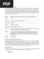Table of Contents Overview of Apple ......................................................................................................................6 Apples Current Challenges ..........................................................................................................7 Apples Current Vision and Need for change...........................................................................7 Apples Current mission and Need for change .........................................................................8 Apples Current Position .............................................................................................................8 Competition ................................................................................................................................9 External Audit and External Factor Evaluation .......................................................................... 10 Opportunities ........................................................................................................................ 10 Threats .................................................................................................................................. 10 Social factors......................................................................................................................... 11 Political factors ..................................................................................................................... 11 Environmental Factors .......................................................................................................... 12 Technological factors ............................................................................................................ 12 Apple EFE Matrix ................................................................................................................. 12 Internal Audit & Key Financial Ratio Analysis ......................................................................... 13 VRIN/VRIO Model............................................................................................................... 13 Value .................................................................................................................................... 13 Rarity .................................................................................................................................... 14 Imitability ............................................................................................................................. 14 Non Substitutable .................................................................................................................. 14 Internal Factor Evaluation ..................................................................................................... 14 Strengths ............................................................................................................................... 14 Weakness .............................................................................................................................. 15 Apple IFE Matrix .................................................................................................................. 15 Porters five forces ................................................................................................................ 16 Threats of new entrants .................................................................................................... 16 Bargaining power of suppliers.......................................................................................... 16 Bargaining power of buyers ............................................................................................. 17 Threats of substitute products........................................................................................... 17 3