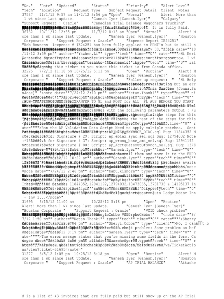 " "Date" "Updated" "Status" "Priority" "Alert Level" "Tech" "Location" Request Type Subject Request Detail Client Notes 37537 11/1/12 9:57 am 11/2/12 3:56 pm "Open" "Normal" Alert! More than 1 wk since last update. "Ganesh Iyer [Ganesh.Iyer]" "Calgary" "Support Request : Oracle" "Canadian Trial Balance Waggoners Trucking" "Hello, 161.21001.000.0000.000.0000.0000 Transaction Payment Currency Date Cancelled Original Remaining Oct 9687594 Not AP 557.07 Apr 7868715 Fully CAD 1,594.96 WAGGONERS 2,152.03 Accounts 3815 Calgary, Canada p: keri.ramsay@geokinetics.com Waggoners 1,559.71 Total Keri Thanks, Geokinetics geokinetics.com" Invoices Invoices 403.265.1696 4, Paid 19, Ramsay -Paid for 2012 Status 2011 32nd Amount Payable AB T1Y Trucking Date Amount Account Party TRUCKING Type Number Exploration, Street 7C1 Canada | has NE 403.265.1693 f: appeared "Keri Inc. Ramsay on my |[Keri.Ramsay]" Trial d: 403.717.4858 Balance report. "" It is fully Paid. 36732 10/11/12 12:35 pm 11/7/12 8:13 am "Open" "Normal" Alert! M ore than 1 wk since last update. "Ganesh Iyer [Ganesh.Iyer]" "Houston Corporate " "Support Request : Oracle" "Expense Report IE24251" "Rob Bowness Iexpense # IE24251 has been fully applied to PPMT's but is still s howing Accounts 3815 Calgary, Canada p: keri.ramsay@geokinetics.com [attachment Keri Thanks, Geokinetics geokinetics.com 403.265.1696 Ramsay -on 32nd Payable AB T1Y aging Exploration, name=image001.png]" Street 7C1 report Canada | NE 403.265.1693 f: asInc. remaining "Keri balance | Ramsay d: 403.717.4858 $91.22. [Keri.Ramsay]" (January 30,"<note 2011) date=""10 /11/12 3:59 pm"" author=""Yazhen.Li"" type=""tech"" time=""0"" rate="""">Hi Keri , We I ran need the a data Agingfix report for this and saw invoice. the invoice I willIE24251 start ashows vacation on this fromreport. tomorrow. I wi ll askdate=""11/7/12 <note </note> Yazhen Thanks, someone in the8:13 support am""team author=""Yazhen.Li"" to take care of issue. type=""tech"" time=""0"" rat I am assigning this ticket to you since this ticket is from Canada office. e="""">Ganesh, </note>" Yazhen Thanks, 32225 7/2/12 11:18 pm 10/25/12 5:13 pm "Open" "Routine" Alert! M ore than 1 wk since last update. "Ganesh Iyer [Ganesh.Iyer]" "Houston Corporate " "Support Request : Oracle" "Follow up request: " "Hi Help desk This Jonna Accounts 601 Pinkenba ph: Australia fax: Sent: To: Cc: Subject: Importance: Please Again; Kind Thanks. ____________________________________________ Geokinetics From: jonna.sanjose@geokinetics.com Hi Requesting SanJose Help Curtin +61 'Help Daud is regards +61 A. Jonna Monday, advise I still Desk would San Payable Hossain Auto QLD Desk'; Avenue to (Australasia) 7 High Jose 7 status appearing 32685611 4 Lodge clear appreciate 4008 32685622 June Yazhen East Motor status of Li 2012 the in your Pty 1:06 Inn our of request Ltd this June-12 prompt PM Invinvoice; lodged 19295 action closing -on status I in 04-June-12. have exception. this needs tried regard. revalidation but an err revalidating or This Jonna Accounts 601 Pinkenba ph: Australia fax: [attachment Appreciate Kind Thanks. ____________________________________________ Geokinetics jonna.sanjose@geokinetics.com occurred Curtin +61 invoice appeared regards +61 A. Payable San QLD your Avenue per (Australasia) 7 name=AUTO was Jose 7 in 32685611 4008 32685622 attached prompt paid our East May-2012 but LODGE action screen showing Pty MOTOR closing in Ltd shot. this as 019295.docx]" IN ""needs exceptions. regard. revalidation"" "Jonna in Oracle. SanJose [Jonna.Sa nJose]" "<note date=""7/24/12 2:10 pm"" author=""Ketan.Thanki"" type=""tech"" ti me=""0"" <note Ketan</note> date=""10/17/12 rate="""">Approved 2:45 pm"" to apply author=""Ganesh.Iyer"" these patches to DEV2B. type=""tech"" time=""0"" rate="""">INVOICEID _RUN CREATE ACCOUNTING, 16622 TRANFER TO GL and POST for ALL PL AUS BEFORE YOU START RUNNING * set where Enter *Patch * update Ouptut select Output process_Flag Run invoice_id value 11844352, 12941192* GDF the Select AP_TEMP_DATA_DRIVER_9738413 file * for FIX_ fix for from AP_MISC_INVOICE_DIAG.sql ap_wrong_base_amt_sel.sql for AP_MISC_INVOICE_FIX.sql l_bug_no: p_user_name: p_resp_name: p_proposed_undo_date: =ap_temp_data_driver_10635312; <> 'N' ap_upg_dup_supContact_sel.sql 16622; 9738413 GANESH.IYER AUS Payables 30-SEP-2012 isOutput Output Manager 9738413-diag-14_36_10.html is returned :9738413-fix-14:44:14.html is /usr/tmp/9574881-diag-14:47:1 10635312-diag-14:30:40.html no rows selected 3.html set where * update process_Flag Run invoice_id @ap_undo_act_encumb_acctg.sql AP_TEMP_DATA_DRIVER_9574881 = 'N' <> 16622; with the following parameters Output : /u sr/tmp/9574881-acctg-15:19:37.html Enter *Patch set where * *Patch *Output No output update process_Flag Run Output Invoice Output: Run run value source_id invoice_id 12794032* records 13473065 the @ap_ebtax_sync_sel.sql AP_NOT_NULL_QTY_INV_SEL.sql 13781736* ap_AcctgDateOutOfSynch_sel.sql @$AP_TOP/patch/115/sql/ap_inv_event_status_code_fix.sql @$AP_TOP/patch/115/sql/ap_ebtax_sync_fix.sql AP_NOT_NULL_QTY_INV_FIX.sql :: ap_temp_data_driver_6992111 ap_temp_data_driver_10335213 9773150-diag-15:58:24.html AP_TEMP_DATA_DRIVER_9773150 for ap_wrong_base_amt_fix.sql /usr/tmp/10335213-diag-15:15:31.html id 6992111-fix-15:25:25.html /usr/tmp/9574881-fix-14:52:52.html /usr/tmp/10335213-fix-15:53:02.html /usr/tmp/9773150-fix-16:01:46.html /usr/tmp/8531305-diag-16:04:27.html were 16622 l_bug_number: l_user_name: l_resp_name: date_to_sweep: <> * = 'N' <> 16622; updated. 16622; not in this GANESH.IYER AUS 12941192 30-SEP-2012 PayablesSkipping select. Manager the rest of the steps for this *Patch list] [*] patch Run14195137* Output Invoice ap_inv_event_status_code_sel.sql :id /usr/tmp/6992111-diag-16:08:25.html 16622 not in this select. Skipping the rest of the steps for this [/list] <note patch * Run Invoice Create date=""7/17/12 Invoice Accounting Validation Validation 3:49 Failed</note> terminated pm"" for author=""