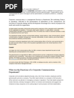 Corporate communication is the communication issued by a corporate / organization / body / institute to all its public(s). "Publics" here can be both internal (employees, stakeholders, i.e. share and stock holders) and external (agencies, channel partners, media, government, industry bodies and institutes, educational institutes and general public). http://en.wikipedia.org/wiki/Corporate_communication