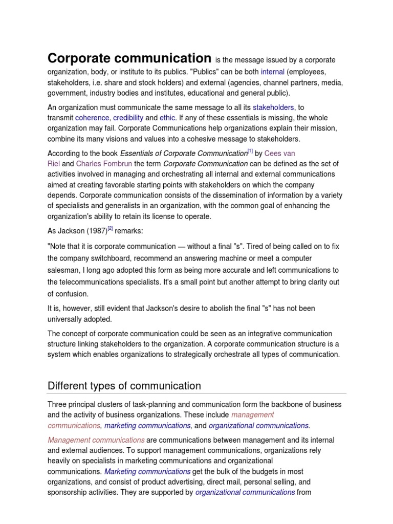 organization, body, or institute to its publics. "Publics" can be both internal (employees, stakeholders, i.e. share and stock holders) and external (agencies, channel partners, media, government, industry bodies and institutes, educational and general public). An organization must communicate the same message to all its stakeholders, to transmit coherence, credibility and ethic. If any of these essentials is missing, the whole organization may fail. Corporate Communications help organizations explain their mission, combine its many visions and values into a cohesive message to stakeholders. According to the book Essentials of Corporate Communication[1] by Cees van Riel and Charles Fombrun the term Corporate Communication can be defined as the set of activities involved in managing and orchestrating all internal and external communications aimed at creating favorable starting points with stakeholders on which the company depends. Corporate communication consists of the dissemination of information by a variety of specialists and generalists in an organization, with the common goal of enhancing the organization's ability to retain its license to operate. As Jackson (1987)[2] remarks: "Note that it is corporate communication without a final "s". Tired of being called on to fix the company switchboard, recommend an answering machine or meet a computer salesman, I long ago adopted this form as being more accurate and left communications to the telecommunications specialists. It's a small point but another attempt to bring clarity out of confusion. It is, however, still evident that Jackson's desire to abolish the final "s" has not been universally adopted. The concept of corporate communication could be seen as an integrative communication structure linking stakeholders to the organization. A corporate communication structure is a system which enables organizations to strategically orchestrate all types of communication.