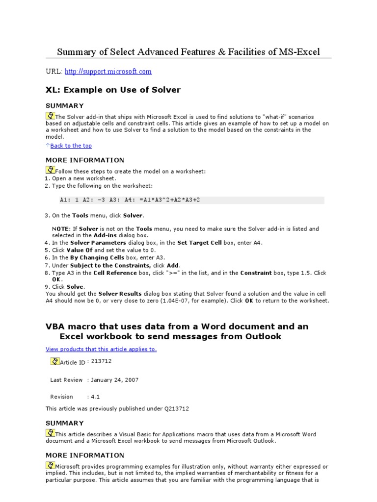 This article describes a Visual Basic for Applications macro that uses data from a Microsoft Word document and a Microsoft Excel workbook to send messages from Microsoft Outlook.