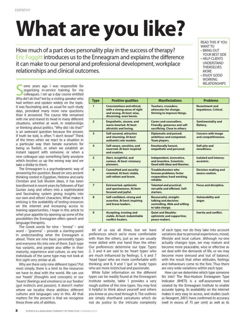 There are five main ways in which the Enneagram may be helpful to speech and language therapists. Firstly, it will be of personal interest to many therapists simply wanting to get some insight into their own personalities. Why did I do that? is an important question, and the correct answer helps us get to the root of who we are, what we are like and what kind of work we should do. Many of us who have engaged in Enneagram training have found that it changes the way we treat people and adds depth to our relationships because it enables deep insight into others attitudes and needs. Secondly, as discussed recently in this magazine (Middlemiss, 2009), conflicts at work can be a source of considerable stress. Understanding their cause (and we may be part of the problem as often as the solution!) will offer us a way forward in resolving them. It may be that one colleague (a type 5, for instance) takes a very rational approach, whereas another (a type 4) approaches it with a greater degree of emotional intelligence. But the former may berate the latter for being overly indulgent and emotional, while the latter might complain that the other is too cold and distant. The truth is, both approaches have their value. The Enneagram offers us mutual understanding, so that we can work better together and benefit from each others strengths rather than complain about each others weaknesses. Thirdly, we recognise that we come to the therapeutic situation not as cold, distant professionals but as human beings. Firstly we bring our humanity, then we bring our skills. The Enneagram helps us with the Burnsian task (as in his poem To a Louse) of seeing ourselves as others see us, hence enabling us to modify our behaviours so as to establish a better rapport with clients. We may come over as somewhat cold, or as controlling, or even as overly emotional. The notion that we can maintain a professional and impersonal faade is of course nave, as our real personalities find a way to break through. Fourthly, and again touching on areas recently covered in the excellent Winning Ways series, the Enneagram helps in professional development. Some types work independently more easily than others; some will work as team players whilst others will be