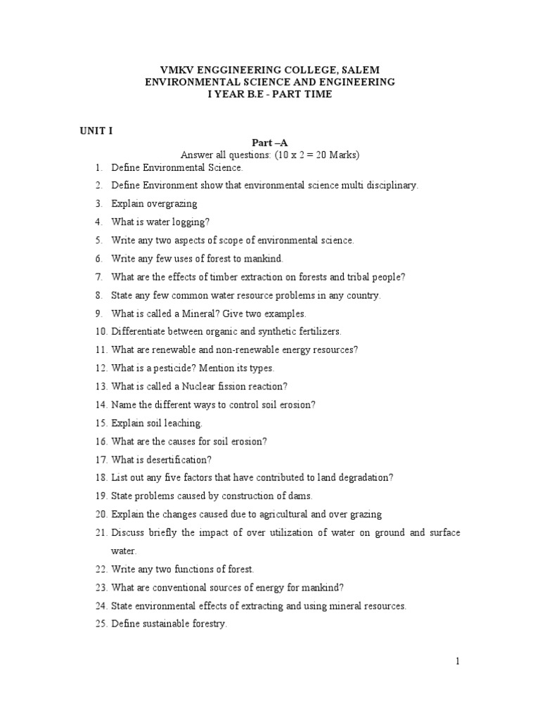 E - PART TIME UNIT I Part A Answer all questions: (10 x 2 = 20 Marks) 1. Define Environmental Science. 2. Define Environment show that environmental science multi disciplinary. 3. Explain overgrazing 4. What is water logging? 5. Write any two aspects of scope of environmental science. 6. Write any few uses of forest to mankind. 7. What are the effects of timber extraction on forests and tribal people? 8. State any few common water resource problems in any country. 9. What is called a Mineral? Give two examples. 10. Differentiate between organic and synthetic fertilizers. 11. What are renewable and non-renewable energy resources? 12. What is a pesticide? Mention its types. 13. What is called a Nuclear fission reaction? 14. Name the different ways to control soil erosion? 15. Explain soil leaching. 16. What are the causes for soil erosion? 17. What is desertification? 18. List out any five factors that have contributed to land degradation? 19. State problems caused by construction of dams. 20. Explain the changes caused due to agricultural and over grazing 21. Discuss briefly the impact of over utilization of water on ground and surface water. 22. Write any two functions of forest. 23. What are conventional sources of energy for mankind? 24. State environmental effects of extracting and using mineral resources. 25. Define sustainable forestry. 1