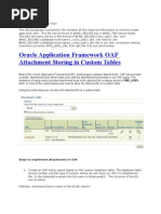 Create EO,VO add it to AM. Create below variable and accessor inside Managed Bean or Backing Bean. import org.apache.myfaces.trinidad.model.UploadedFile; ... private UploadedFile _file; public UploadedFile getFile() { return _file; } public void setFile(UploadedFile file) { _file = file; } On JSF Page(jspx/jsf) or Page Fragment(jsff) 1)From DataControl unde XxAttachmentVO1 --> Operations --> Drag CreateInsert method and drop as ADF Button. (When you click this Button it creates Blank row). 2)From Common Components drag inputFile(af:inputFile) component and drop on page. Make sure you put value as #{<yourMangedBean>.file} <af:inputFile label="Upload File" id="if1" value="#{<yourMangedBean>.file}"/> 3)From Common Components drag Button and drop after inputFile component. Write below code on Button action Listner. <af:commandButton text="Upload" id="cb11" action="#{<yourManagedBean.uploadAttach}"/> 4)Add Commit action method in Bindings. 5)For Page Form make sure usesUpload property is True. <af:form id="f1" usesUpload="true">