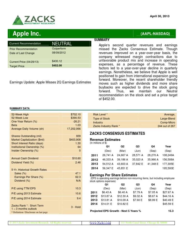 Apple s second quarter 2013 earnings of $10.09 per share missed the Zacks Consensus Estimate by approximately $0.09. Earnings per share declined 18.0% year over year and 26.9% sequentially in the reported quarter. Revenues Total revenue was up 11.3% year over year but declined 20.0% sequentially to $43.60 billion, slightly ahead of the company s guided range of $41.0 billion to $43.0 billion. However, revenues fell shy of the Zacks Consensus Estimate of $44.30 billion for the fourth consecutive quarter. iPhone unit sales climbed 7.0% year over year but decreased 22.0% from the previous quarter to 37.43 million. Revenues climbed 3.0% from the year-ago quarter but plunged 25.1% from the previous quarter to $22.96 billion in the quarter. iPhone growth continues to be driven by strong adoption from a number of U.S. government agencies as well as companies such as Cisco and GlaxoSmithKline. iPad unit sales jumped 65.0% year over year but plunged 40% sequentially to 19.48 million. iPad revenues were up 39.6% year over year but declined 18.1% quarter over quarter to $8.75 billion in the quarter. Apple experienced strong iPad sales in most of its markets, particularly in Greater China (up 138.0% year over year) and Japan where sales more than doubled on a year-over- year basis. Apple shipped 3.95 million Macintosh in the reported quarter, down 2.0% from the year-ago quarter and 3.0% on a sequential basis. Revenues increased 7.0% year over year but declined 1.0% quarter over quarter to $5.45 billion. iPod units and sales on a year-over-year basis continued to decline in the quarter. Apple sold 5.6 million iPods (down 27.0% year over year) and earned $962.0 million (down 20.0% year over year) in the quarter. On a sequential basis, iPod shipments and revenues plunged 56.0% and 55.0%, respectively. Revenues from iTunes/ Software/ Services improved 30.0% year over year and 12.0% sequentially to $4.11 billion. Accessories surged 15.0% from the year-ago quarter but decreased 25.0% from the previous quarter to $1.38 billion. Retail revenues in the quarter increased 19.1% year over year but declined 18.6% sequentially to $5.24 billion. At quarter end, Apple operated 402 stores worldwide, of which 151 are located outside the U.S. Greater China revenues increased 7.5% year over year and 20.2% sequentially in the reported quarter. Rest of Asia-Pacific and Japan grew 25.7% and 18.5% year over year, respectively. On a sequential basis, Rest of Asia-Pacific and Japan declined 20.8% and 29.4%, respectively. Americas grew 6.6% year over year while Europe increased 11.3% from the year-ago quarter. However, sequentially Americas plunged 30.9% and Europe fell 21.4% in the reported quarter. Margins Gross margin contracted to 37.5% from 47.4% in the year-ago quarter and met the lower end of management s guided range of 37.5% to 38.5%. On a sequential basis, gross margin declined 110 basis points (bps) in the quarter. The gross margin contraction primarily resulted from unfavorable product mix due to higher sales of lower margin iPhone 4 and 4S and iPad minis in the quarter