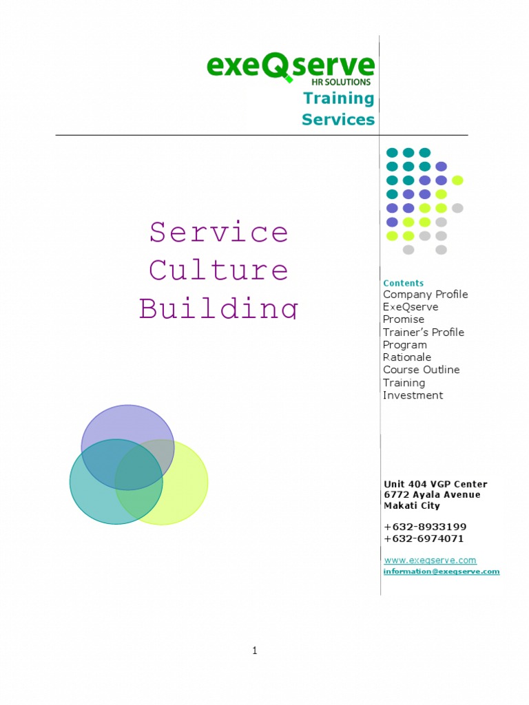 Achieving Service Excellence is a Culture Building Process Service excellence is the fundamental outcome of a productive, successful organization and a motivated workforce. To achieve the higher levels of service, the people must be motivated to go that extra mile. They should embrace a service mindset and build lasting relationships with customers both internal and external. A service culture is one that has everyone in the organization aligned with the companys service philosophies. Achieving organizational alignment however is not just a function of training; it is more than anything, a function of leadership. You can only achieve consistent customer service performance when leaders effectively and consistently send the message that customer service is important. Developing a successful customer service-focused organization requires an ongoing, strategically driven and persistent effort that integrates learning seamlessly with service culture-building on the job. Practical solutions are built into the initiatives that emphasize not only what to do, how to do it and more importantly why they must do it from understanding customer needs to developing customer-focused solutions to recovering masterfully from service errors. We propose a holistic intervention aimed at equipping the companys leader-managers to fine-tune policies and procedures so that they become more responsive to the needs of the customers both internally and externally. We will then conduct aligned workshops aimed at developing every employees capability to appreciate the companys service philosophy and align their actions with their respective departments customer-responsive processes.