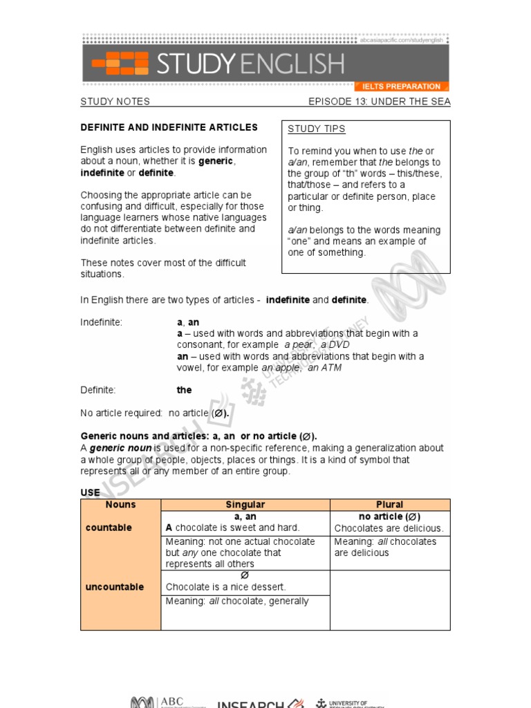 EPISODE 13: UNDER THE SEA STUDY TIPS To remind you when to use the or a/an, remember that the belongs to the group of th words this/these, that/those and refers to a particular or definite person, place or thing. a/an belongs to the words meaning one and means an example of one of something.