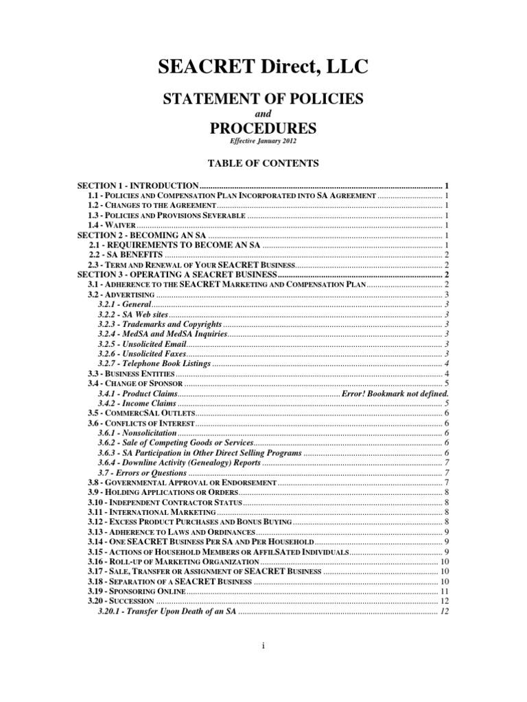 SECTION 1 - INTRODUCTION ................................................................................................................ 1 1.1 - POLICIES AND COMPENSATION PLAN INCORPORATED INTO SA AGREEMENT .............................. 1 1.2 - CHANGES TO THE AGREEMENT ........................................................................................................ 1 1.3 - POLICIES AND PROVISIONS SEVERABLE .......................................................................................... 1 1.4 - WAIVER ............................................................................................................................................. 1 SECTION 2 - BECOMING AN SA ............................................................................................................ 1 2.1 - REQUIREMENTS TO BECOME AN SA ................................................................................... 1 2.2 - SA BENEFITS ................................................................................................................................ 2 2.3 - TERM AND RENEWAL OF YOUR SEACRET BUSINESS.................................................................... 2 SECTION 3 - OPERATING A SEACRET BUSINESS ............................................................................ 2 3.1 - ADHERENCE TO THE SEACRET MARKETING AND COMPENSATION PLAN ................................... 2 3.2 - ADVERTISING .................................................................................................................................... 3 3.2.1 - General ...................................................................................................................................... 3 3.2.2 - SA Web sites .............................................................................................................................. 3 3.2.3 - Trademarks and Copyrights ..................................................................................................... 3 3.2.4 - MedSA and MedSA Inquiries................................................................................................... 3 3.2.5 - Unsolicited Email...................................................................................................................... 3 3.2.6 - Unsolicited Faxes...................................................................................................................... 3 3.2.7 - Telephone Book Listings .......................................................................................................... 4 3.3 - BUSINESS ENTITIES ........................................................................................................................... 4 3.4 - CHANGE OF SPONSOR ....................................................................................................................... 5 3.4.1 - Product Claims........................................................................... Error! Bookmark not defined. 3.4.2 - Income Claims .......................................................................................................................... 5 3.5 - COMMERCSAL OUTLETS.................................................................................................................. 6 3.6 - CONFLICTS OF INTEREST .................................................................................................................. 6 3.6.1 - Nonsolicitation .......................................................................................................................... 6 3.6.2 - Sale of Competing Goods or Services....................................................................................... 6 3.6.3 - SA Participation in Other Direct Selling Programs ................................................................ 6 3.6.4 - Downline Activity (Genealogy) Reports ................................................................................... 7 3.7 - Errors or Questions ..................................................................................................................... 7 3.8 - GOVERNMENTAL APPROVAL OR ENDORSEMENT ............................................................................ 7 3.9 - HOLDING APPLICATIONS OR ORDERS .............................................................................................. 8 3.10 - INDEPENDENT CONTRACTOR STATUS ............................................................................................ 8 3.11 - INTERNATIONAL MARKETING ........................................................................................................ 8 3.12 - EXCESS PRODUCT PURCHASES AND BONUS BUYING ..................................................................... 8 3.13 - ADHERENCE TO LAWS AND ORDINANCES ...................................................................................... 9 3.14 - ONE SEACRET BUSINESS PER SA AND PER HOUSEHOLD ........................................................... 9 3.15 - ACTIONS OF HOUSEHOLD MEMBERS OR AFFILSATED INDIVIDUALS ........................................... 9 3.16 - ROLL-UP OF MARKETING ORGANIZATION .................................................................................. 10 3.17 - SALE, TRANSFER OR ASSIGNMENT OF SEACRET BUSINESS ..................................................... 10 3.18 - SEPARATION OF A SEACRET BUSINESS ..................................................................................... 10 3.19 - SPONSORING ONLINE .................................................................................................................... 11 3.20 - SUCCESSION .................................................................................................................................. 12 3.20.1 - Transfer Upon Death of an SA ............................................................................................ 12