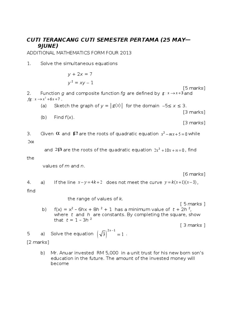 ADDITIONAL MATHEMATICS FORM FOUR 2013 1. Solve the simultaneous equations y + 2x = 7 [5 marks] Function g and composite function fg are defined by g : x x + 3 and fg : x x 2 + 6 x + 7 . (a) Sketch the graph of y = g ( x) for the domain 5 x 3. [3 marks] (b) Find f(x). [3 marks] Given y 2 = xy 1