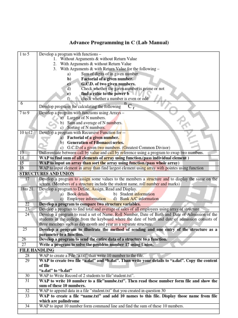Develop programs for calculating the following Cr 7 to 9 Develop a program with functions using Arrays a) Largest of N numbers. b) Sum and average of N numbers. c) Sorting of N numbers. 10 to12 Develop a program with Recursive Function for -a) Factorial of a given number. b) Generation of Fibonacci series. c) G.C.D of a given two numbers. (Greatest Common Divisor) 13 Differentiate between call by value and call by reference using a program to swap two numbers. 14 WAP to find sum of all elements of array using function.(pass individual element ) 15 WAP to input an array than sort the array using function.(pass whole array) 16 WAP to input element in array than find largest element using array with pointes using function STRUCTURES AND UNION 17 Develop a program to assign some values to the members a structure and to display the same on the screen. (Members of a structure include the student name, roll number and marks) 18to 21. Develop a program to Define, Assign, Read and Display. a) Book details b) Student information c) Employee information d) Bank A/C information 22 Develop a program to compare two structure variables. 23 Develop a program to find total and average of sales of all employees using array of structure. 24 Develop a program to read a set of Name, Roll Number, Date of Birth and Date of Admission of the students in the college from the keyboard where the date of birth and date of admission consists of three members such as day month and year as a separate structure. 25 Develop a program to illustrate the method of sending and one entry of the structure as a parameter to a function. 26 Develop a program to send the entire data of a structure to a function. 27 Write a program to solve the problem number 17 using Union. FILE HANDLING 28 WAP to create a File a.txt than write 10 number to the file. 29 WAP to create two file a.dat and b.dat. Than write your details to a.dat. Copy the content of file a.dat to b.dat 30 WAP to Write Record of 2 students to filestudent.txt. 31 WAP to write 10 number to a filenumbe.txt. Then read these number form file and show the sum of these 10 numbers. 32 WAP to append data in a file student.txt that you created in question 30 33 WAP to create a file name.txt and add 10 names to this file. Display those name from file which are palindrome 34 WAP to input 10 number form command line and find the sum of these 10 numbers.