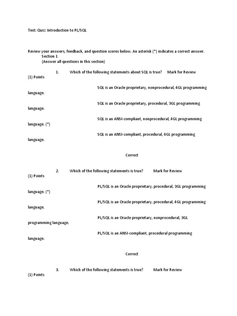 Review your answers, feedback, and question scores below. An asterisk (*) indicates a correct answer. Section 1 (Answer all questions in this section) 1. (1) Points SQL is an Oracle proprietary, nonprocedural, 4GL programming language. SQL is an Oracle proprietary, procedural, 3GL programming language. SQL is an ANSI-compliant, nonprocedural, 4GL programming language. (*) SQL is an ANSI-compliant, procedural, 4GL programming language. Which of the following statements about SQL is true? Mark for Review
