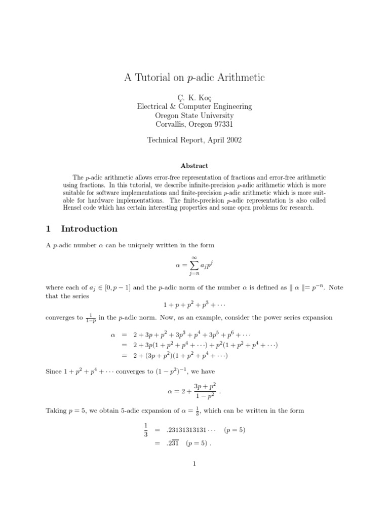 • Applications of p-adic arithmetic in computational algebra and scientific computing.