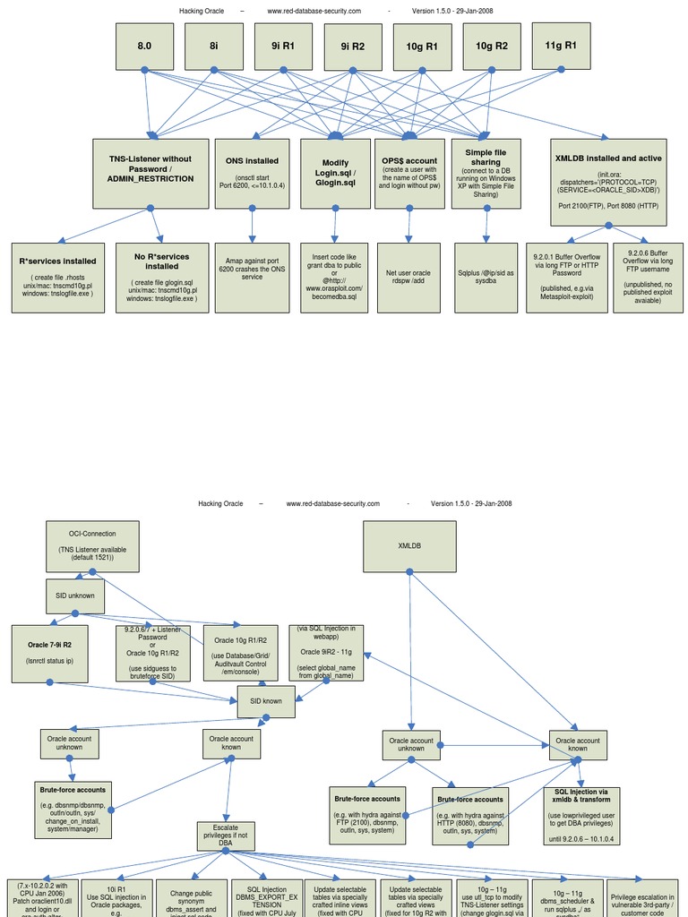 checkpwd: woraauthbf anapassword.sql dbgrep.sql analistener.sql tnscmd sidguess: Oracle Assessment Kit: Oracle Instant Client Oracle SQL Developer Backtrack 2 http://www.red-database-security.com/software/checkpwd.html http://soonerorlater.hu/download/woraauthbf_0.2.zip http://www.red-database-security.com/scripts/anapassword.sql http://www.red-database-security.com/scripts/dbgrep.sql http://www.red-database-security.com/scripts/analistener.sql http://www.jammed.com/~jwa/hacks/security/tnscmd/tnscmd http://www.red-database-security.com/software/sidguess.zip http://www.databasesecurity.com/dbsec/OAK.zip http://www.oracle.com/technology/software/tech/oci/instantclient/index.html http://www.oracle.com/technology/software/products/sql/index.html http://www.remote-exploit.org Hacking Oracle www.red-database-security.com -- fastest multiplatform Oracle dictionary password cracker -- fastest Oracle Brute Force cracker -- get a list of application password + type -- search for a specific string in the database -- analyse Oracle listener log -- control unprotected TNS Listener without Oracle Client -- fastest Oracle dictionary password cracker -- useful tools, e.g. to exploit the alter session bug -- Oracle Instant Client -- GUI Tool for Oracle in Java -- Linux Live CD with many Oracle Security Tools Version 1.5.0 - 29-Jan-2008