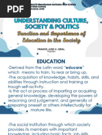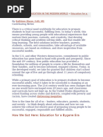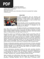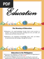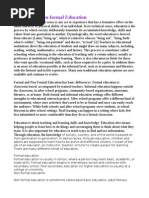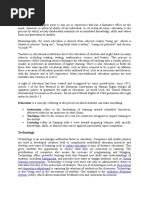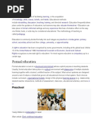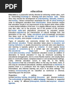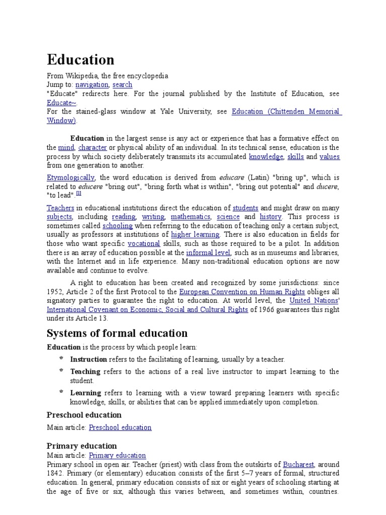 From Wikipedia, the free encyclopedia Jump to: navigation, search "Educate" redirects here. For the journal published by the Institute of Education, see Educate~. For the stained-glass window at Yale University, see Education (Chittenden Memorial Window). Education in the largest sense is any act or experience that has a formative effect on the mind, character or physical ability of an individual. In its technical sense, education is the process by which society deliberately transmits its accumulated knowledge, skills and values from one generation to another. Etymologically, the word education is derived from educare (Latin) "bring up", which is related to educere "bring out", "bring forth what is within", "bring out potential" and ducere, "to lead".[1] Teachers in educational institutions direct the education of students and might draw on many subjects, including reading, writing, mathematics, science and history. This process is sometimes called schooling when referring to the education of teaching only a certain subject, usually as professors at institutions of higher learning. There is also education in fields for those who want specific vocational skills, such as those required to be a pilot. In addition there is an array of education possible at the informal level, such as in museums and libraries, with the Internet and in life experience. Many non-traditional education options are now available and continue to evolve. A right to education has been created and recognized by some jurisdictions: since 1952, Article 2 of the first Protocol to the European Convention on Human Rights obliges all signatory parties to guarantee the right to education. At world level, the United Nations' International Covenant on Economic, Social and Cultural Rights of 1966 guarantees this right under its Article 13.